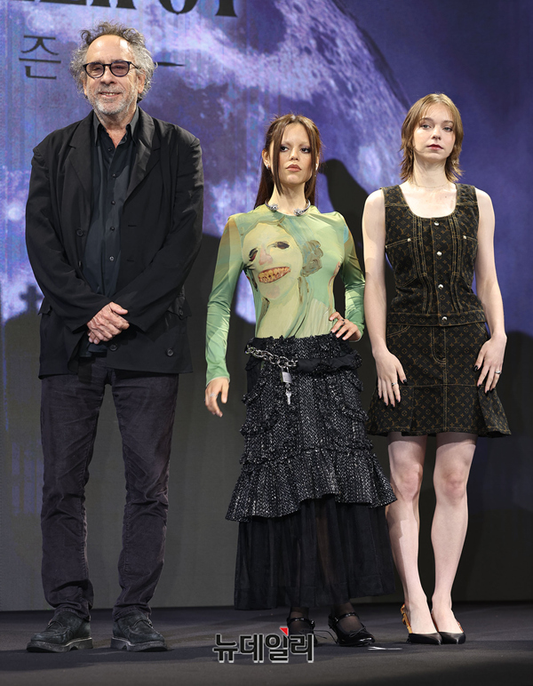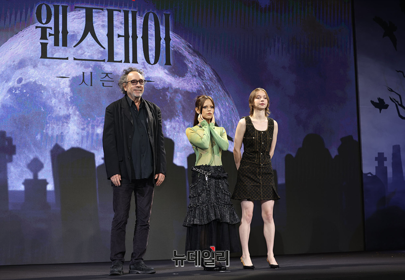 배우 제나 오르테가(왼쪽), 에마 마이어스가 11일 오전 서울 종로구 포시즌스 호텔에서 열린 넷플릭스 시리즈 '웬즈데이 시즌2' 기자간담회에 입장하고 있다.'웬즈데이'는 누적 시청 17억 시간, 넷플릭스 글로벌 TOP 10 TV(영어) 부문 역대 1위를 기록한 시리즈. 시즌2는 새 학기를 맞아 네버모어 아카데미에 돌아온 웬즈데이 아담스가 자신을 둘러싼 더 오싹하고 기이해진 미스터리를 마주한 가운데, 그 뒤에 숨겨진 진실을 찾아가는 이야기를 담았다.기자간담회에는 팀 버튼 감독, 배우 제나 오르테가, 에마 마이어스가 참석했다. 파트2은 8월 6일, 파트2는 9월 3일 각각 공개된다.