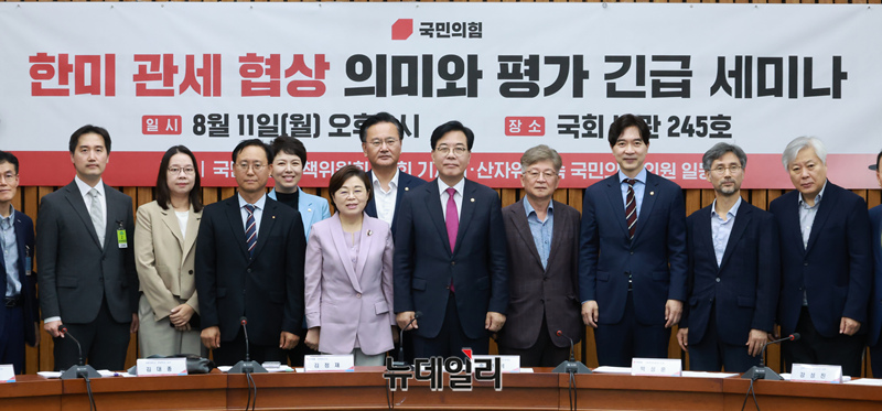 송언석 국민의힘 비상대책위원장 겸 원내대표가 11일 국회에서 열린 '한미 관세 협상 의미와 평가 긴급 세미나'에서 참석자들과 기념촬영하고 있다.