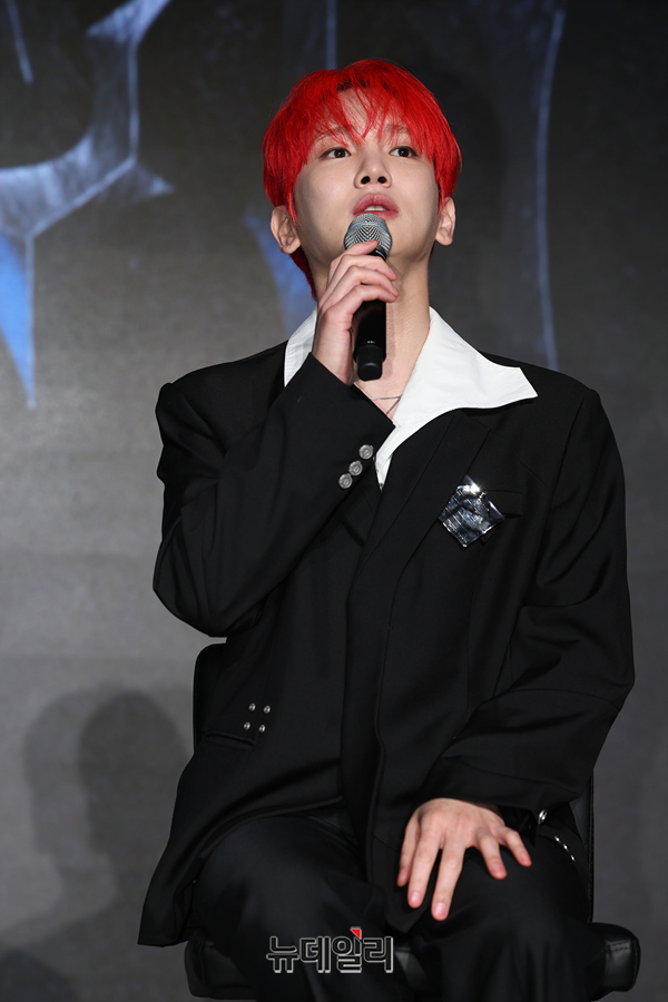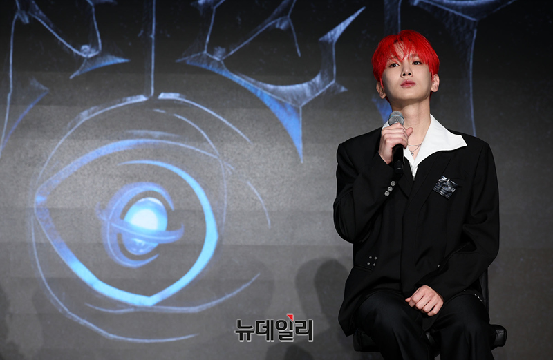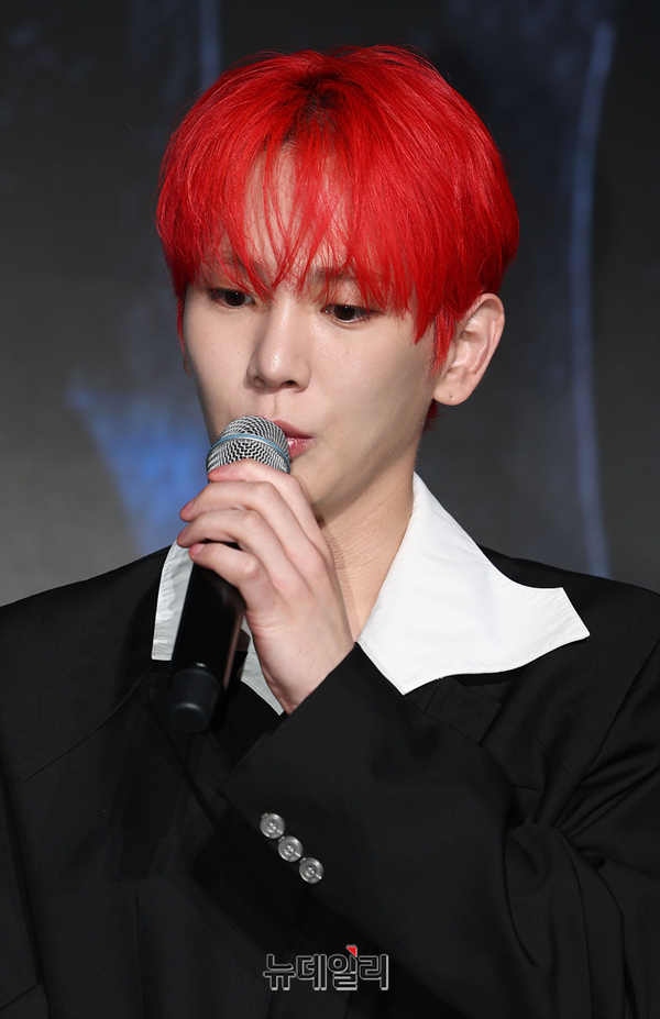 가수 키가 11일 오후 서울 광진구 풀만 앰배서더 서울 이스트폴 브로드웨이에서 열린 정규 3집 'HUNTER(헌터)' 발매 기념 기자간담회에서 수록곡을 소개하고 있다.