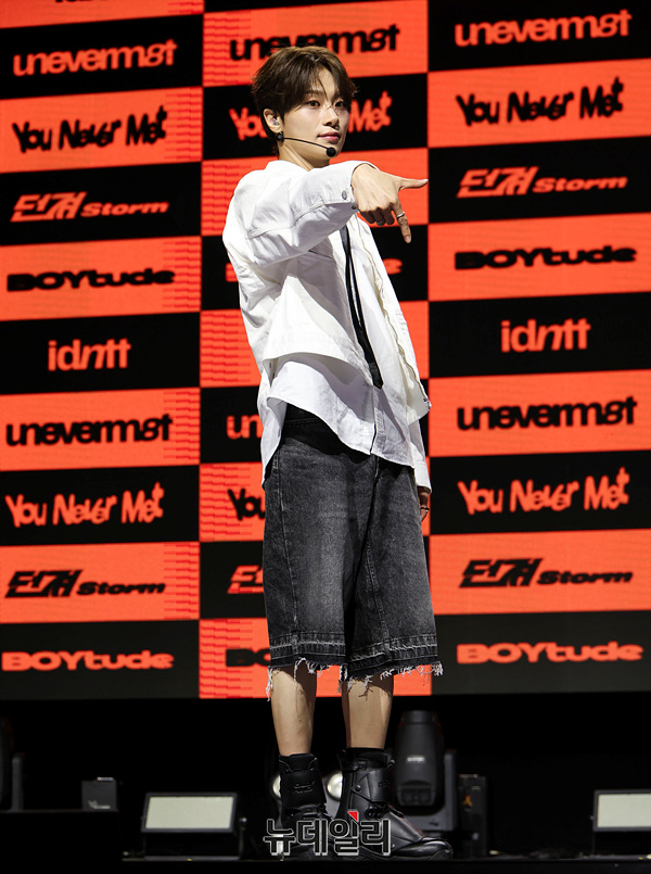 24인조 대형 보이그룹 아이덴티티(idntt)의 유닛그룹 유네버멧(unevermet) 남지운이 11일 오후 서울 용산구 블루스퀘어에서 열린 데뷔 쇼케이스에서 포즈를 취하고 있다.이번 앨범은 트리플 타이틀곡 '유 네버 멧(You Never Met)' '던져(Storm)' '보이튜드(BOYtude)'를 포함해 '뉴'(New)' '인스턴트 케미스트리(Instant Chemistry)' '이고 리미트리스(EGO : Limitless)' '에덜레슨스(Adolescence)'까지 일곱 곡을 담았다.