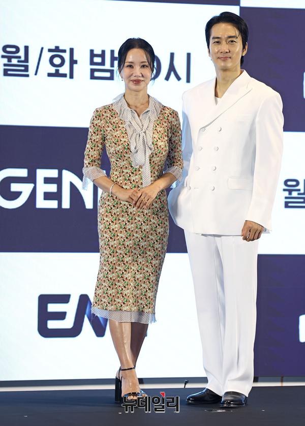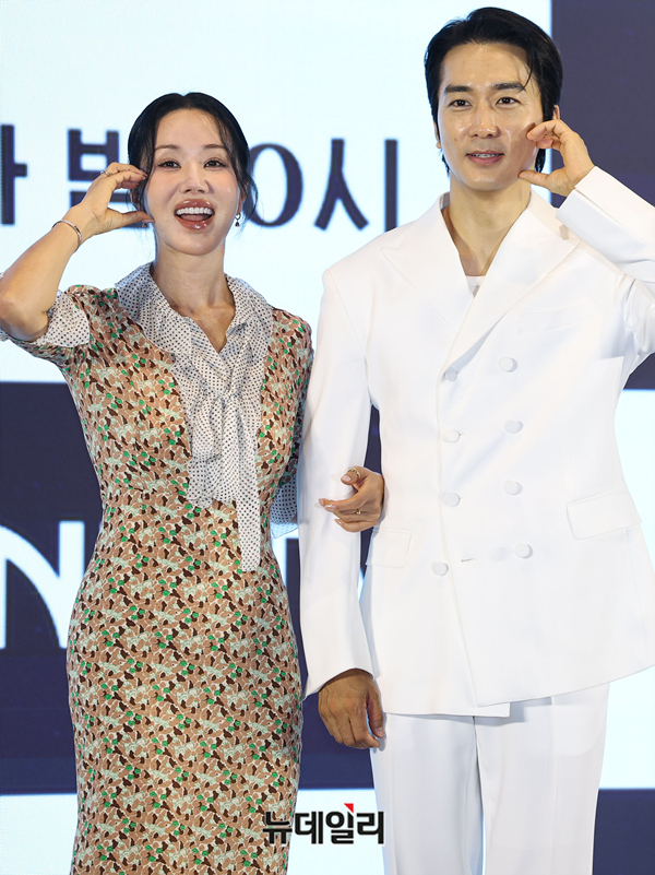 배우 엄정화, 송승헌이 12일 오후 서울 구로구 신도림 디큐브시티 더 세인트에서 열린 지니 TV 오리지널 '금쪽같은 내 스타(극본 박지하, 연출 최영훈)' 제작발표회에서 포즈를 취하고 있다.