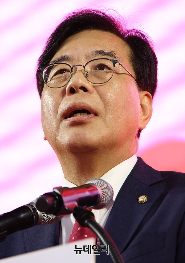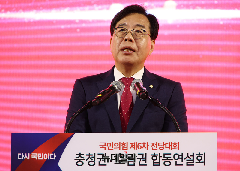 송언석 국민의힘 비상대책위원장 겸 원내대표가 13일 오후 대전 서구 배재대학교에서 열린 국민의힘 제6차 전당대회 충남권-호남권 합동연설회에서 인사말을 하고 있다. (대전=서성진 기자)