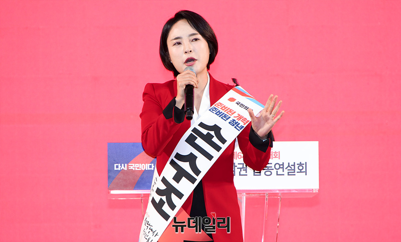 손수조 국민의힘 청년최고위원 후보가 13일 오후 대전 서구 배재대학교에서 열린 국민의힘 충청·호남권 합동연설회에서 정견발표를 하고 있다. (대전=서성진 기자)