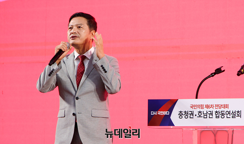 김태우 국민의힘 최고위원 후보가 13일 오후 대전 서구 배재대학교에서 열린 국민의힘 충청·호남권 합동연설회에서 정견발표를 하고 있다. (대전=서성진 기자)