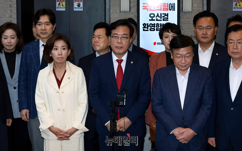 송언석 국민의힘 비상대책위원장 겸 원내대표 및 소속 의원들이 13일 오후 서울 여의도 중앙당사에서 민중기 특별검사팀(김건희 특검팀)의 '건진법사 청탁 의혹' 관련 당사 압수수색에 대해 입장을 밝히고 있다.