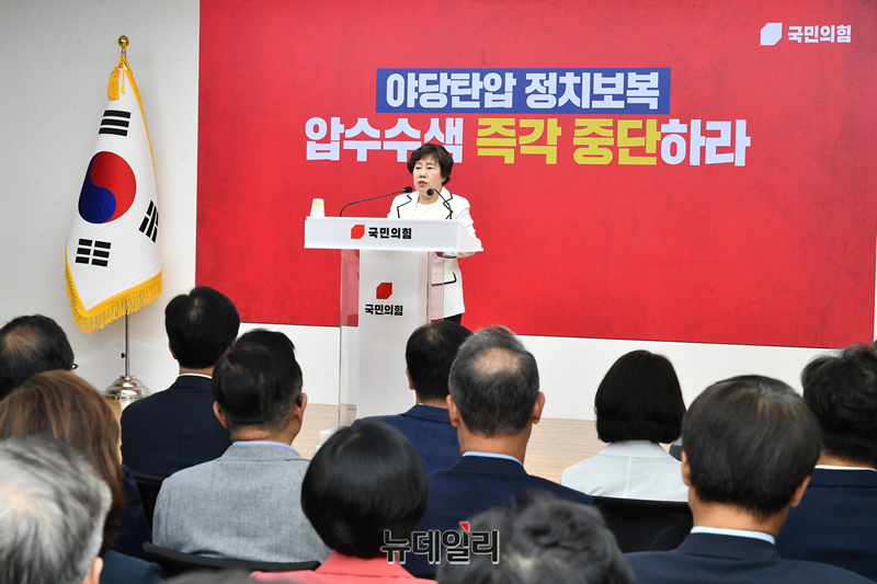 조배숙 국민의힘 의원이 14일 서울 여의도 중앙당사에서 열린 긴급의원총회에서 모두발언을 하고 있다.