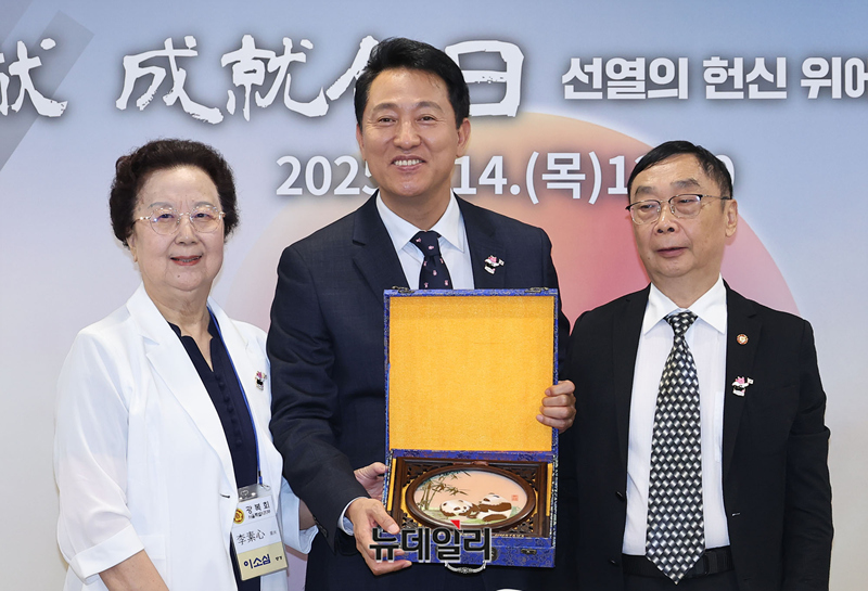 오세훈 서울시장이 14일 오전 서울시청에서 광복80주년을 기념해 열린 해외 독립운동가 후손 초청 간담회에서 후손으로 부터 기념품을 전달받고 있다.
