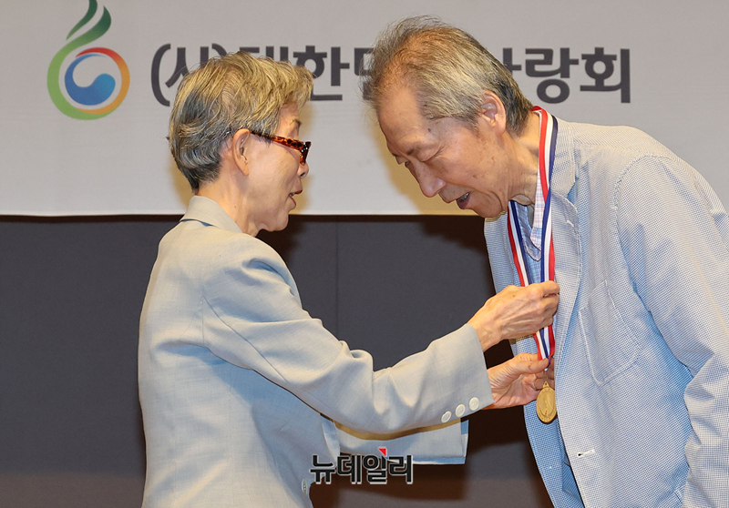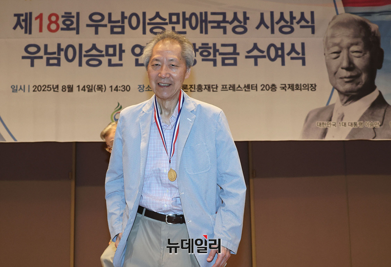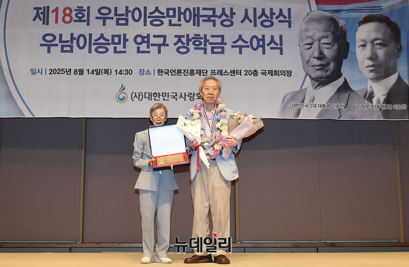 양동안 한국학중앙연구원 명예교수가 14일 오후 서울 중구 한국프레스센터에서 열린 제18회 우남이승만애국상시상식에서 대상을 수상하고 있다.이날 행사는 건국 77주년 기념식을 시작으로 제18회 우남이승만애국상시상식과 장학금 수여식이 함께 진행됐다.제18회 우남이승만애국상시상식 대상에는 △양동안 한국학중앙연구원 명예교수, 청년상에는 △김상종 자유시민교육 대표 △이명준 전국학생수호연합 대표가 수상했다.이어진 우남이승만장학금수여식에는 이서연 연세대 대학원생이 수여자로 선정됐다.