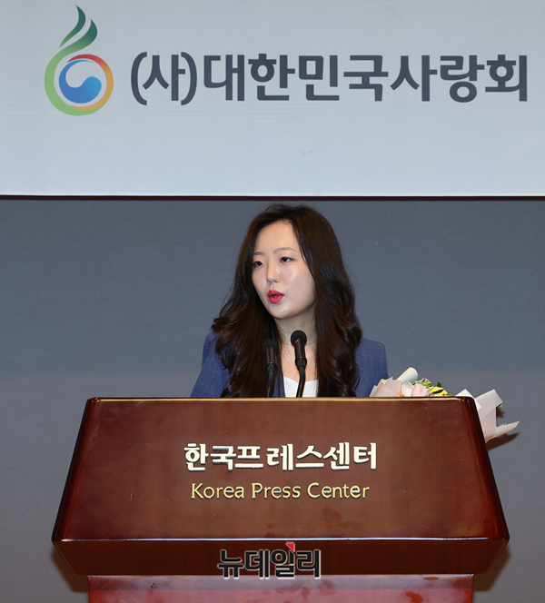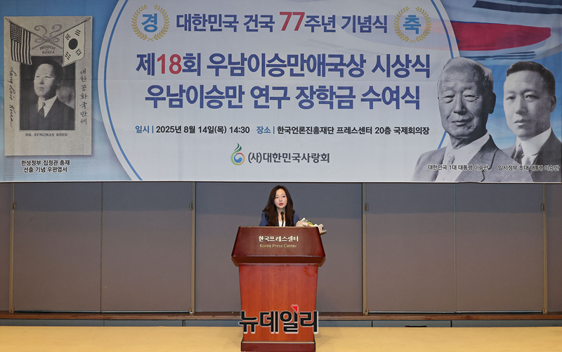 이서연 연세대대학원 학생이 14일 오후 서울 중구 한국프레스센터에서 열린 우남이승만장학금 수여식에서 기념촬영을 하고 있다.이날 행사는 건국 77주년 기념식을 시작으로 제18회 우남이승만애국상시상식과 장학금 수여식이 함께 진행됐다.제18회 우남이승만애국상시상식 대상에는 △양동안 한국학중앙연구원 명예교수, 청년상에는 △김상종 자유시민교육 대표 △이명준 전국학생수호연합 대표가 수상했다.이어진 우남이승만장학금수여식에는 이서연 연세대 대학원생이 수여했다.