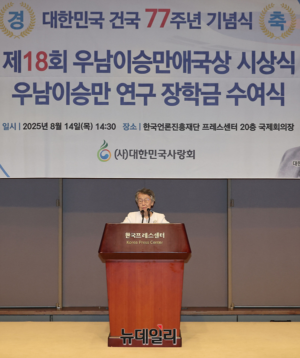 이인호 서울대 명예교수가 14일 오후 서울 중구 한국프레스센터에서 열린 우남이승만장학금 수여식에서 인사말을 하고 있다.이날 행사는 건국 77주년 기념식을 시작으로 제18회 우남이승만애국상시상식과 장학금 수여식이 함께 진행됐다.제18회 우남이승만애국상시상식 대상에는 △양동안 한국학중앙연구원 명예교수, 청년상에는 △김상종 자유시민교육 대표 △이명준 전국학생수호연합 대표가 수상했다.이어진 우남이승만장학금수여식에는 이서연 연세대 대학원생이 수여했다.