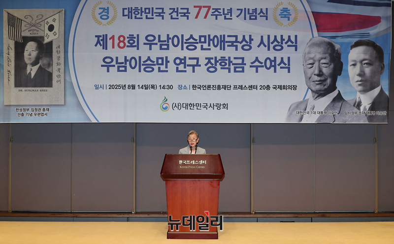 김길자 대한민국사랑회장이 14일 오후 서울 중구 한국프레스센터에서 열린 제18회 우남이승만애국상시상식에서 맺음말을 하고 있다.이날 행사는 건국 77주년 기념식을 시작으로 제18회 우남이승만애국상시상식과 장학금 수여식이 함께 진행됐다.제18회 우남이승만애국상시상식 대상에는 △양동안 한국학중앙연구원 명예교수, 청년상에는 △김상종 자유시민교육 대표 △이명준 전국학생수호연합 대표가 수상했다.이어진 우남이승만장학금수여식에는 이서연 연세대 대학원생이 수여했다.