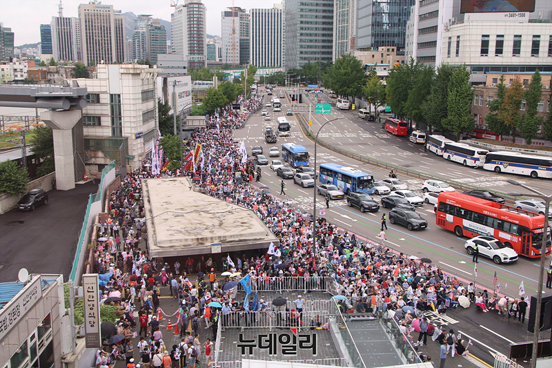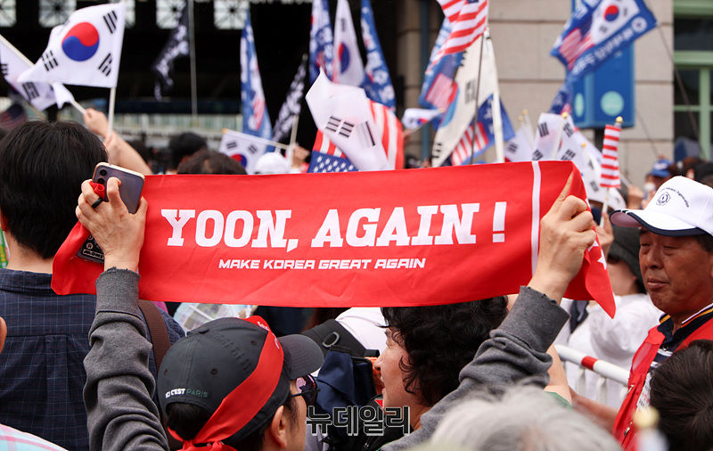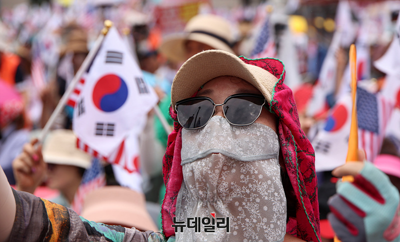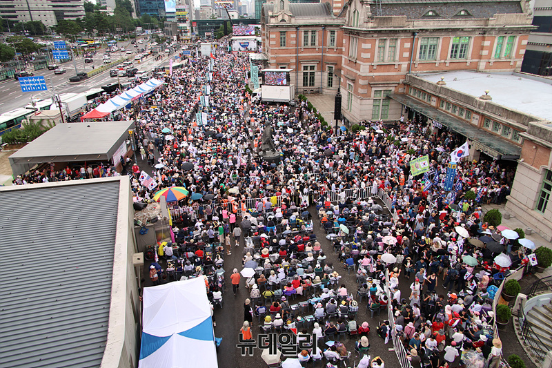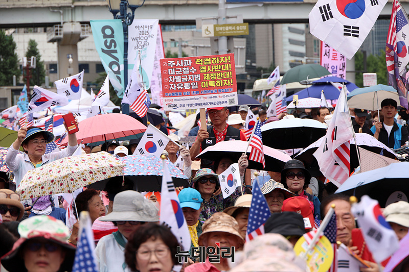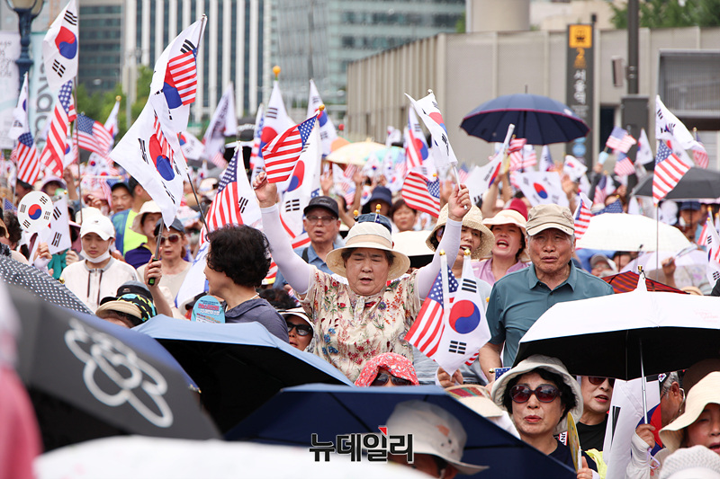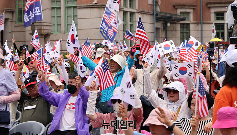 8.15 국가정상화를 위한 광화문 국민대회가 열린 15일 오후 서울 용산구 서울역 앞에서 시민들이 태극기와 성조기를 흔들고 있다.