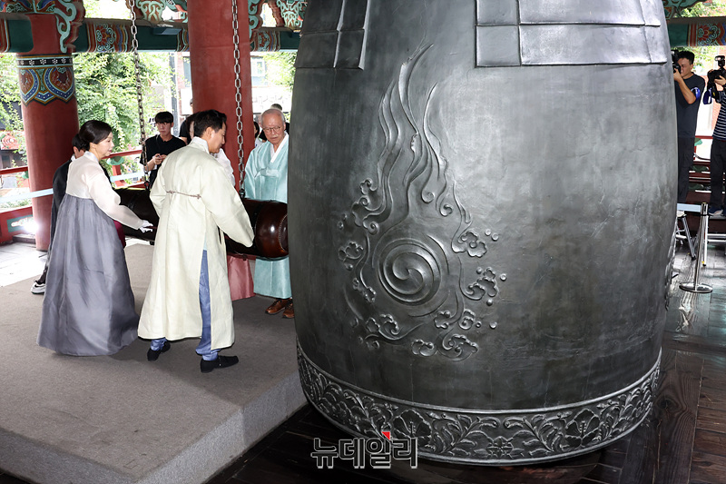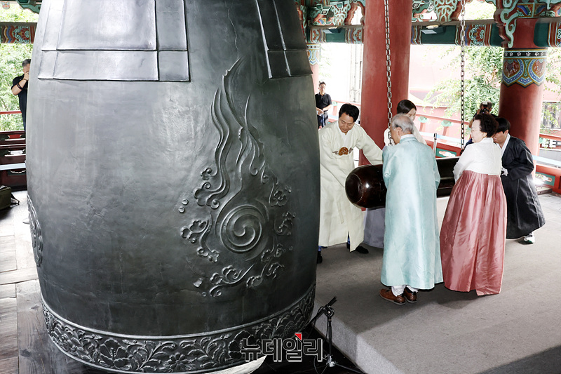오세훈 서울시장과 독립유공자 후손 등이 15일 서울 종로구 보신각에서 제80주년 광복절을 맞아 기념 타종을 하고 있다.