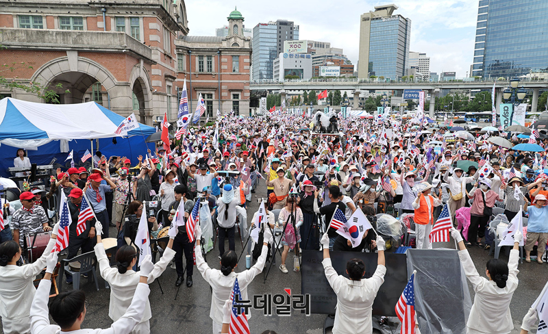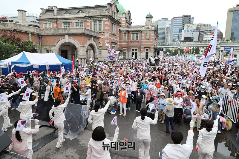 제80주년 광복절과 건국 77주년인 15일 오후 서울역광장에서 열린 8.15 국가정상화를위한 광화문 국민대회에서 시민들이 태극기와 성조기를 들고 국민대회에 참석하고 있다.