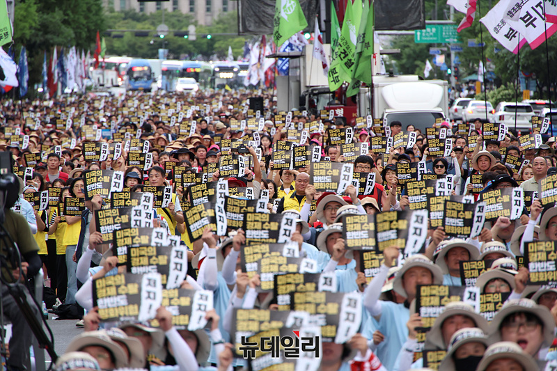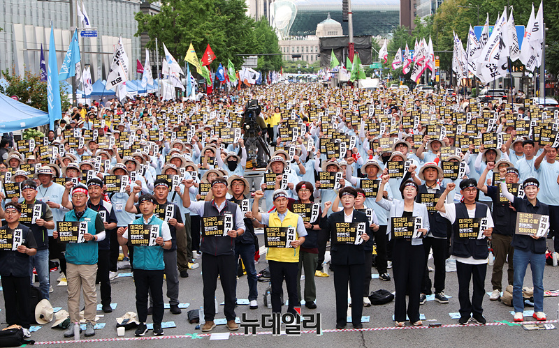 양경수 민노총 위원장을 비롯한 참석자들이 15일 오후 서울 중구 세종대로에서 열린 전국노동자대회에서 구호를 외치고 있다.