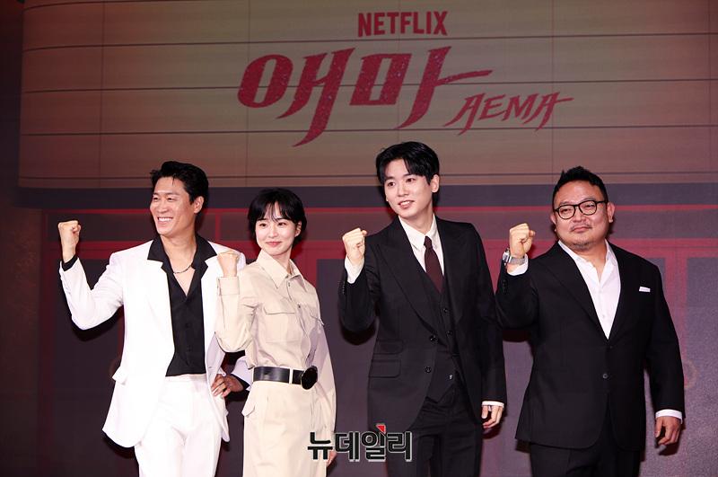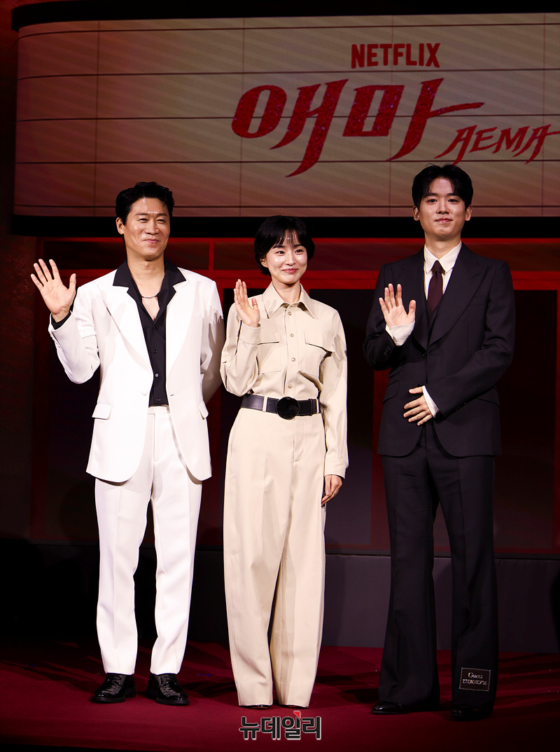배우 조현철, 진선규, 방효이 18일 오전 서울 마포구 호텔 나루 서울 엠갤러리에서 열린 넷플릭스 오리지널 시리즈 '애마' 제작발표회에서 포즈를 취하고 있다.