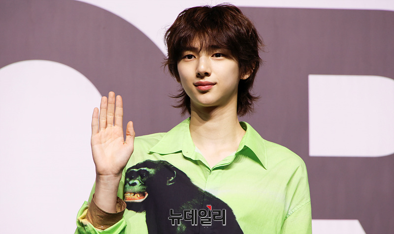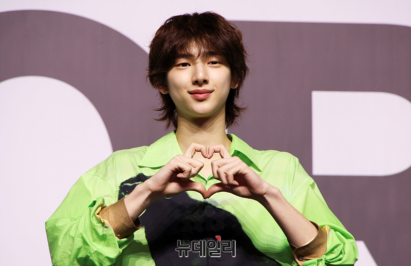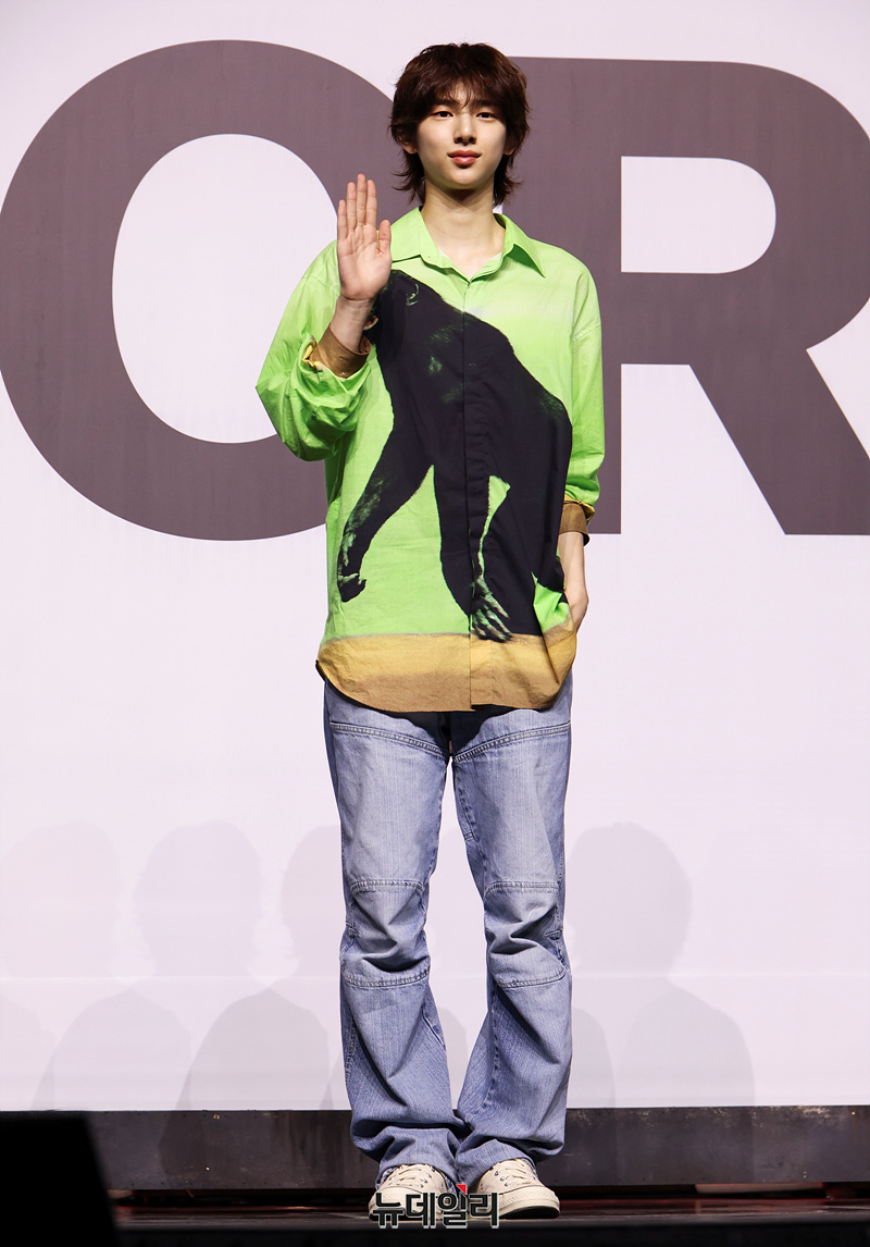 신인 보이그룹 코르티스(CORTIS) 주훈이 18일 오후 서울 용산구 블루스퀘어에서 열린 데뷔 쇼케이스에서 포즈를 취하고 있다.