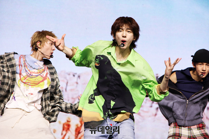 신인 보이그룹 코르티스(CORTIS) 마틴, 주훈, 건호, 성현, 제임스가 18일 오후 서울 용산구 블루스퀘어에서 열린 데뷔 쇼케이스에서 무대를 선보이고 있다.