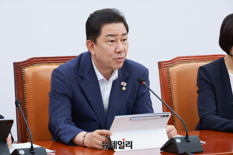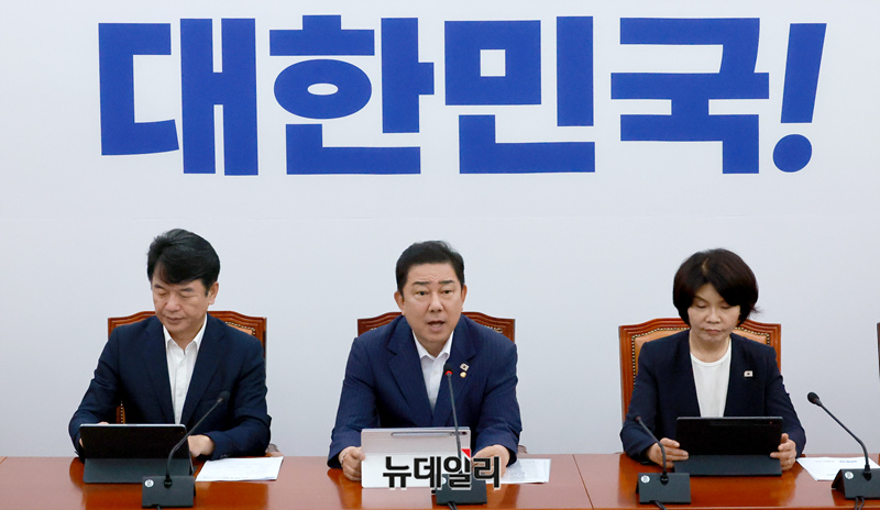 김병기 더불어민주당 원내대표가 19일 오전 국회에서 열린 원내대책회의에서 모두발언을 하고 있다.