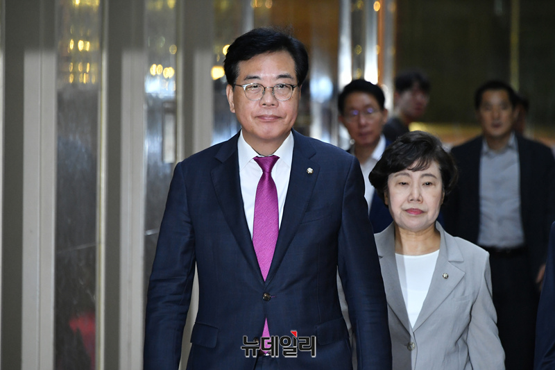 송언석 국민의힘 비상대책위원장 겸 원내대표와 의원 들이 19일 오전 국회 의장실에 현안 관련 논의를 위해 방문을 하고 있다.