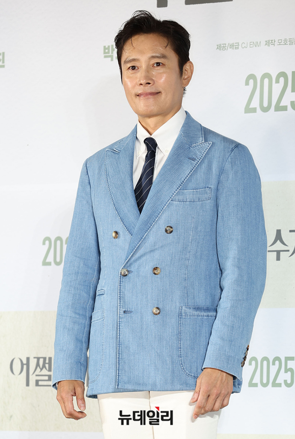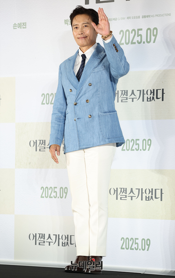 배우 이병헌이 19일 오전 서울 CGV용산아이파크몰에서 열린 영화 '어쩔수가 없다(감독 박찬욱)' 제작보고회에서 포즈를 취하고 있다.