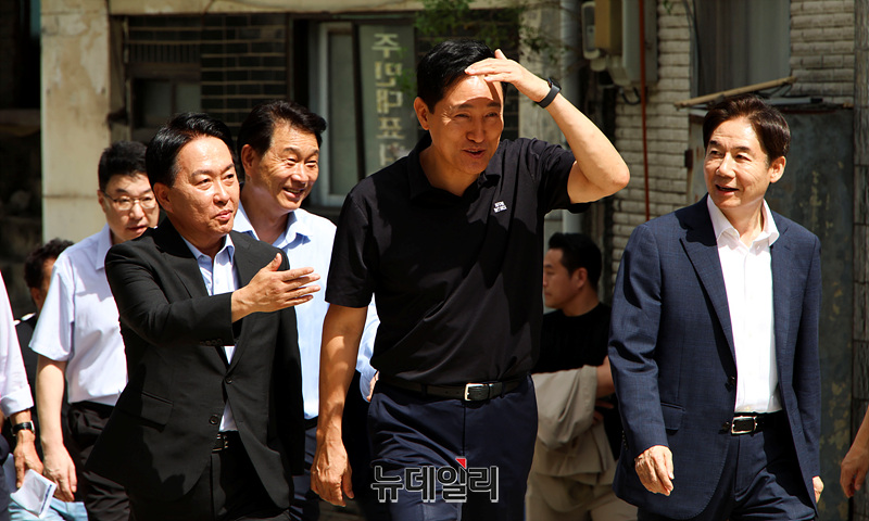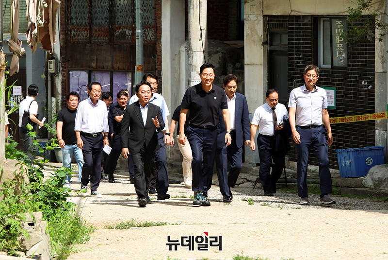 오세훈 서울시장, 이성헌 서대문구청장이 19일 오후 서울 서대문구 모아타운 현장 점검에 나서고 있다.