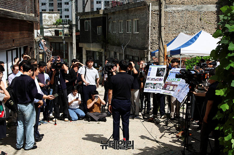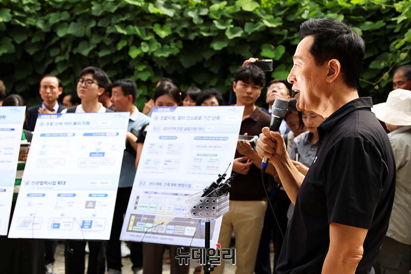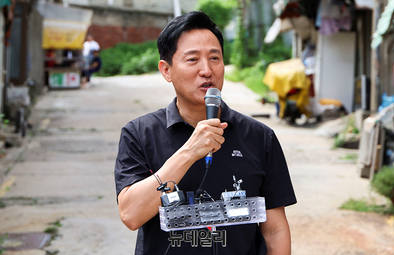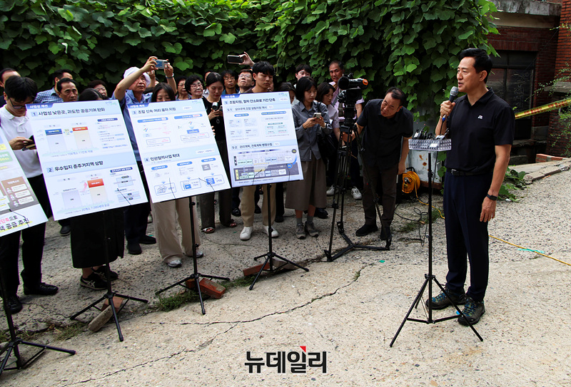 오세훈 서울시장이 19일 오후 서울 서대문구 모아타운 현장 점검에 앞서 모두발언을 하고 있다.