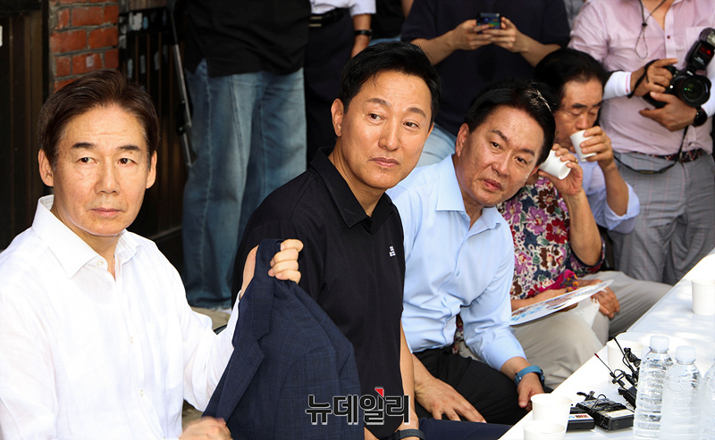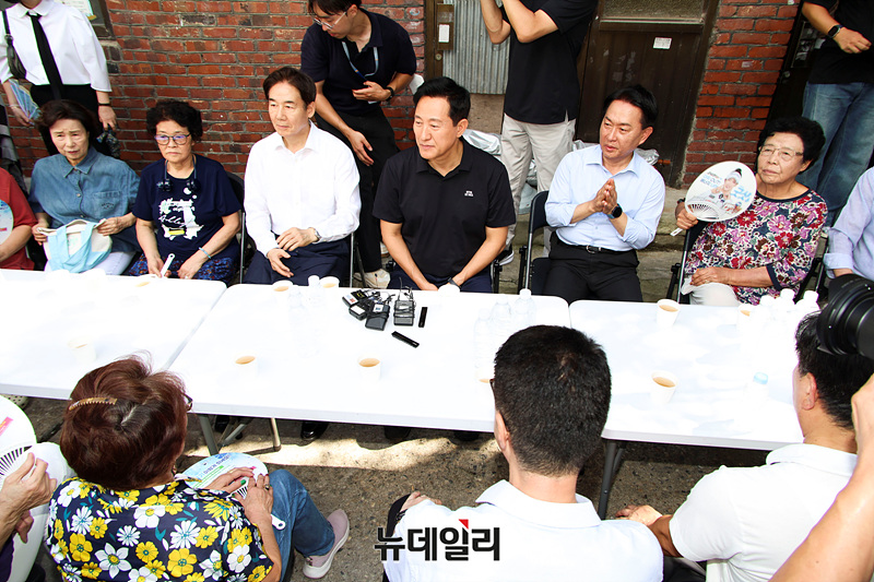 오세훈 서울시장이 19일 오후 서울 서대문구 모아타운 현장 간담회에 참석해 자리하고 있다.