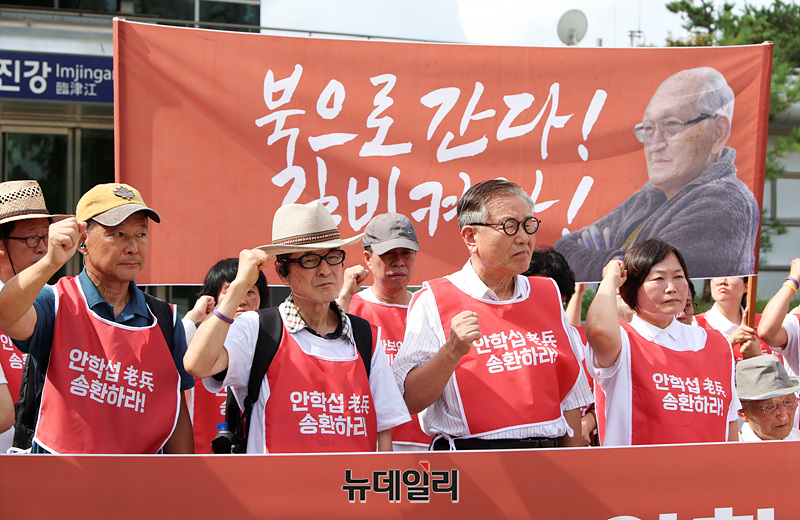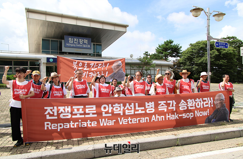 비전향장기수 안학섭 씨를 비롯한 참석자들이 20일 오전 경기도 파주시 임진강역에서 열린 전쟁포로 안학섭 노병 송환 결의대회에서 구호를 외치고 있다.