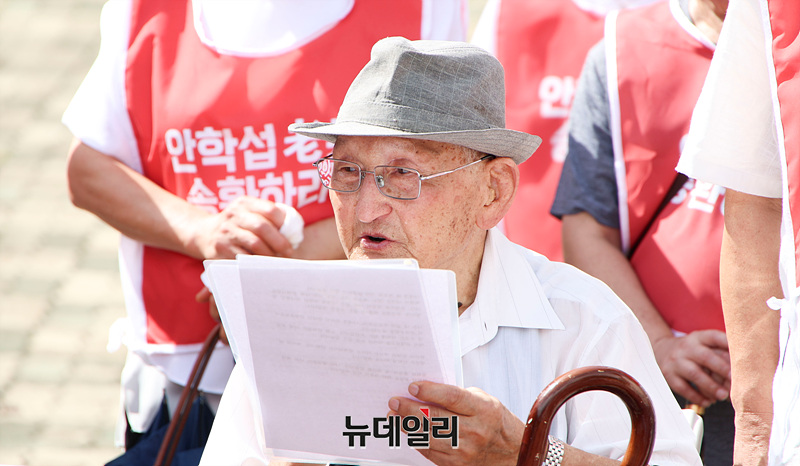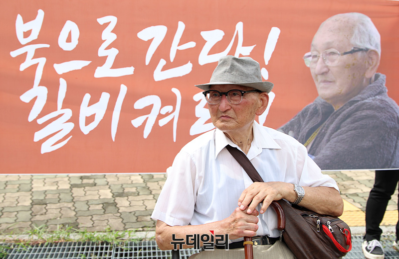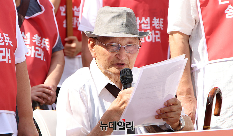비전향장기수 안학섭 씨가 20일 오전 경기도 파주시 임진강역에서 열린 전쟁포로 안학섭 노병 송환 결의대회에서 발언하고 있다.