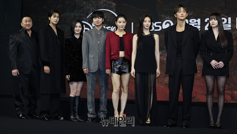 주연배우들이 20일 오전 서울 중구 앰버서더 서울 풀만에서 열린 디즈니+, KBS 2TV 시리즈 '트웰브(감독 강대규 한윤선)' 제작보고회에서 포즈를 취하고 있다.동양의 12지신을 모티브로 한 시리즈 '트웰브'는 인간을 수호하기 위해 인간의 모습으로 살아가고 있는 12천사들이 악의 무리에 맞서는 전투를 그린 액션 히어로물. 동양의 전통 설화에 판타지적 요소와 독창적인 스토리텔링을 더해 선과 악, 우정 등 전 세계 시청자들이 공감할 수 있는 보편적 정서를 담았다.마동석, 박형식, 서인국, 성동일, 이주빈, 고규필, 강미나, 성유빈, 안지혜, 레지나 레이 등이 출연한다. 8월 23일 디즈니+, KBS 2TV에서 첫 공개.