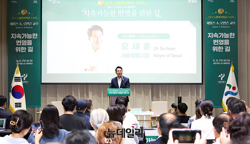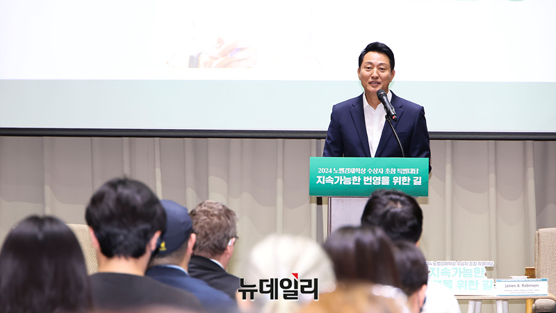 오세훈 서울시장이 21일 오전 서울 중구 서울시청 대회의실에서 '지속가능한 번영을 위한 길'을 주제로 열린 노벨경제학상 수상자 제임스 로빈슨 교수 초청 특별대담에서 인사말을 하고 있다.