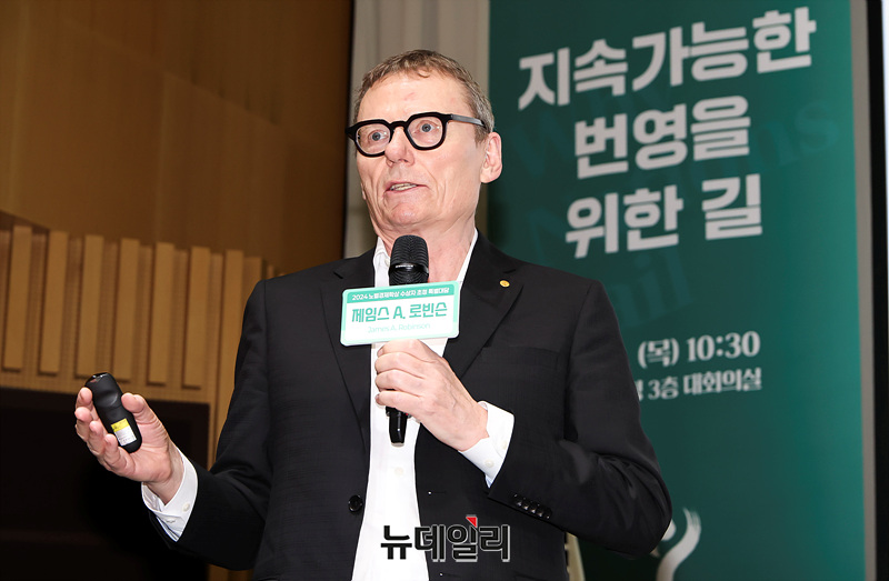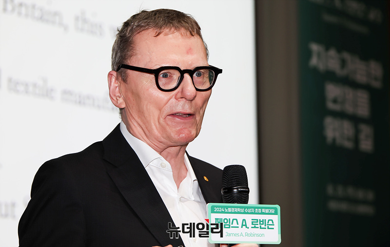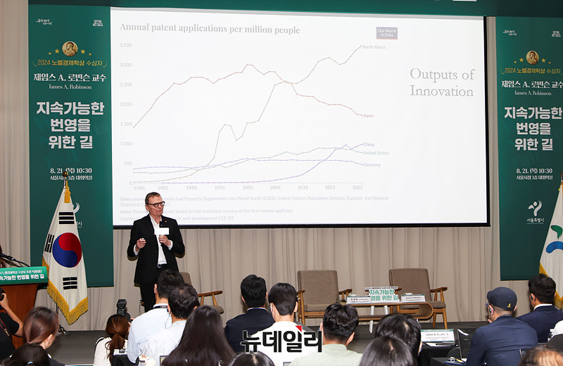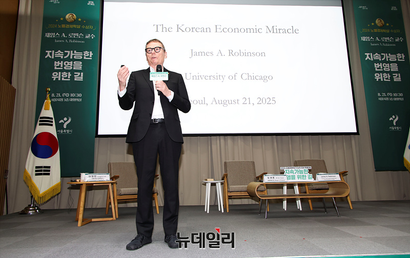 노벨경제학상 수상자 제임스 로빈슨 교수가 21일 오전 서울 중구 서울시청 대회의실에서 '지속가능한 번영을 위한 길'을 주제로 열린 특별대담에서 강연하고 있다.