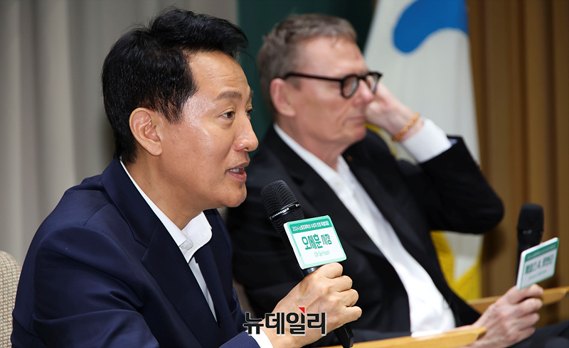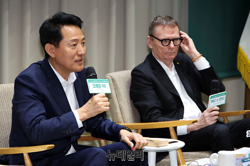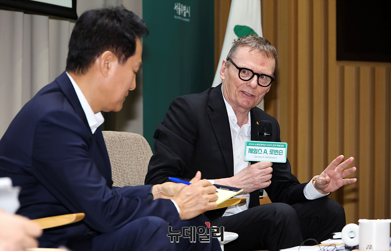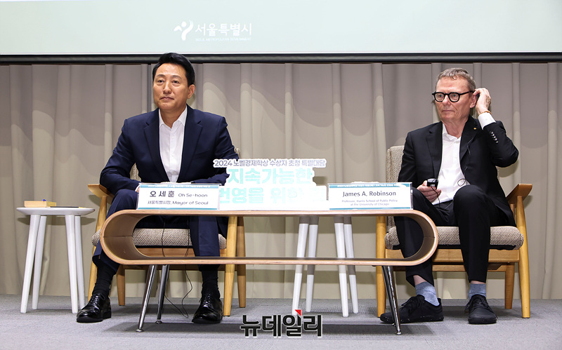 오세훈 서울시장과 노벨경제학상 수상자 제임스 로빈슨 교수가 21일 오전 서울 중구 서울시청 대회의실에서 '지속가능한 번영을 위한 길'을 주제로 열린 특별대담에서 대담을 나누고 있다.