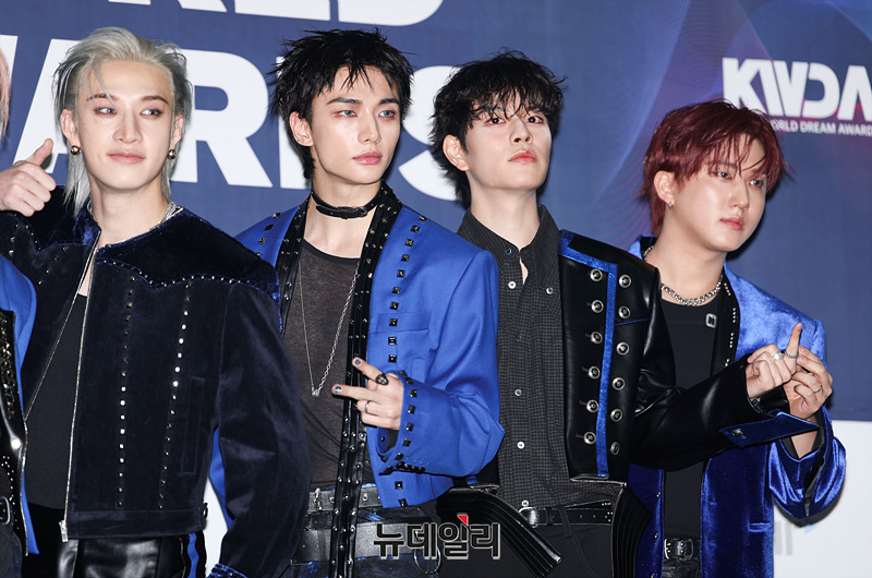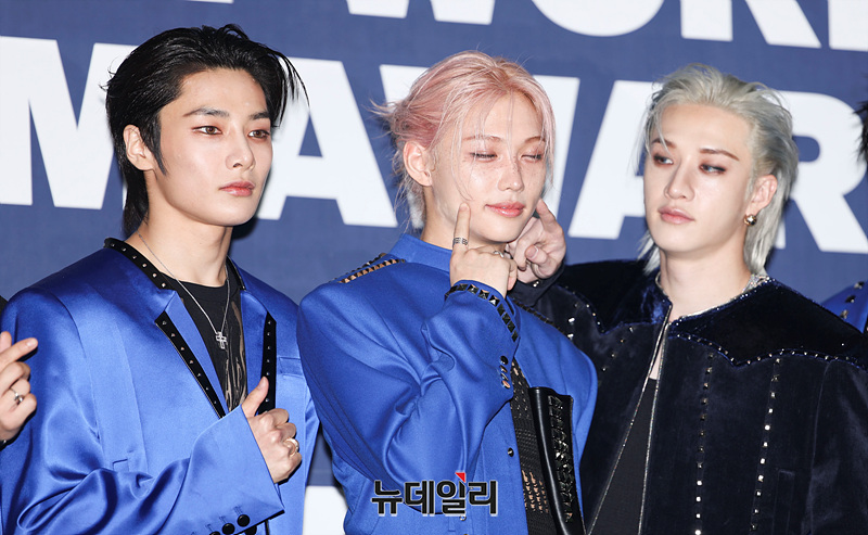 그룹 스트레이 키즈가 21일 오후 서울 송파구 잠실 실내체육관에서 열린 '2025 케이 월드 드림 어워즈( K-WORLD DREAM AWARDS 2025)' 블루카펫에서 포즈를 취하고 있다.