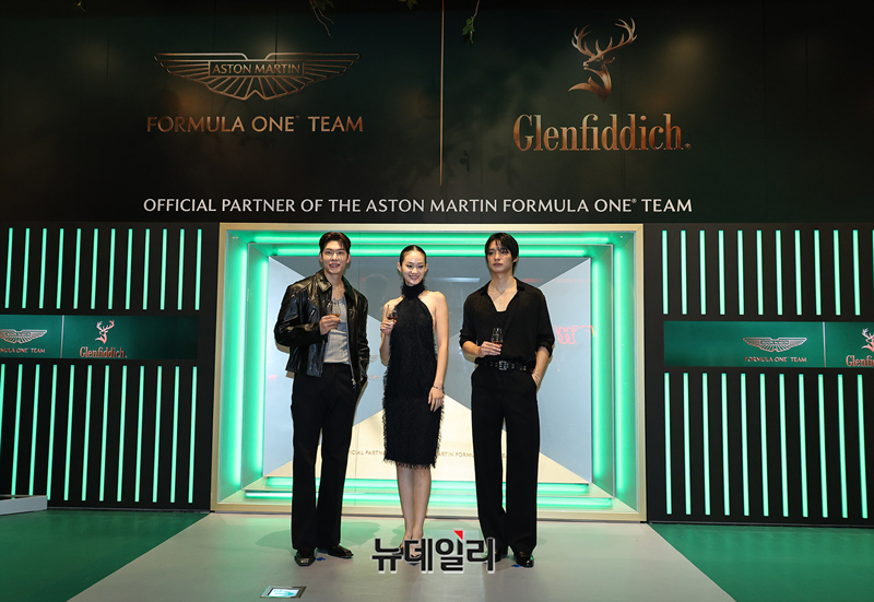 셰프 오스틴 강(왼쪽부터), 모델 신현지, 채종석이 22일 오전 서울 여의도 더현대 서울에서 열린 ‘글렌피딕 16년 한정판’ 팝업스토어 오픈 기념행사에서 포즈를 취하고 있다.