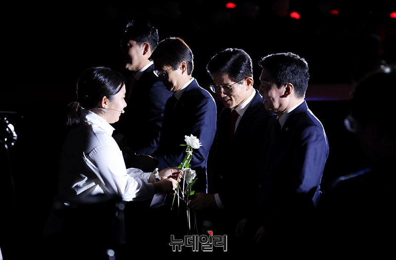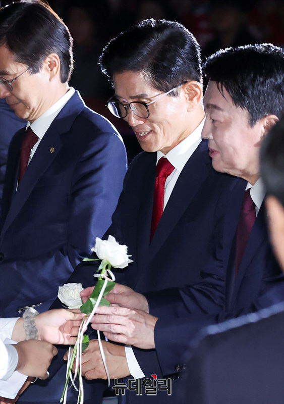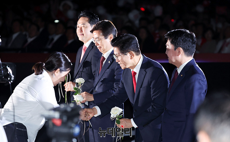 안철수, 김문수, 조경태, 장동혁 국민의힘 당대표 후보가 13일 오후 청주 오스코에서 열린 국민의힘 당대표 선출을 위한 전당대회에서 꽃을 선물받고 있다.