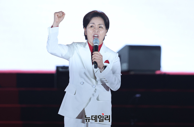 양향자 국민의힘 최고위원 후보가 13일 오후 청주 오스코에서 열린 국민의힘 당대표 선출을 위한 전당대회에서 지지를 호소하고 있다.