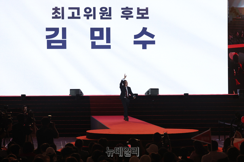 김민수 국민의힘 최고위원 후보가 13일 오후 청주 오스코에서 열린 국민의힘 당대표 선출을 위한 전당대회에서 지지를 호소하고 있다.