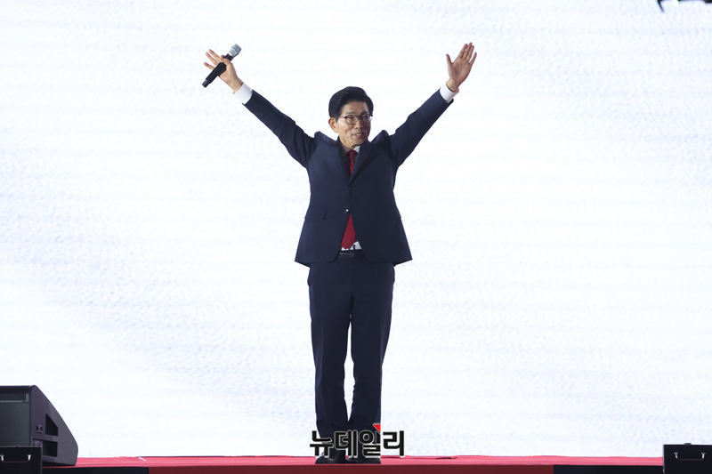 김문수 국민의힘 당대표 후보가 13일 오후 청주 오스코에서 열린 국민의힘 당대표 선출을 위한 전당대회에서 지지를 호소하고 있다.