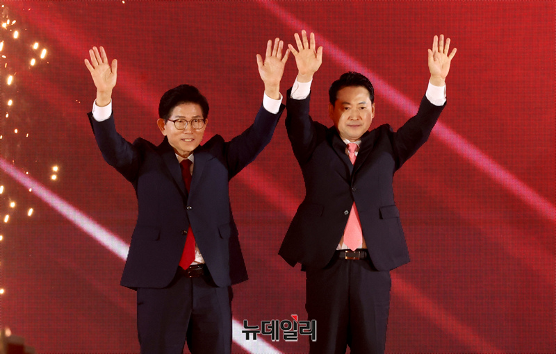결선에 진출한 김문수, 장동혁 국민의힘 당 대표 후보가 22일 충북 청주시 흥덕구 청주오스코에서 열린 제6차 전당대회에서 손을 흔들고 있다. (충북 청주=이종현 기자)