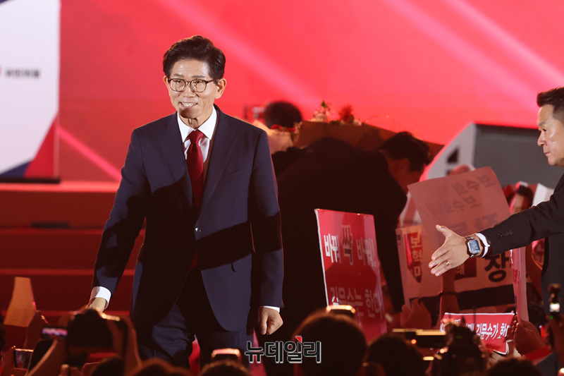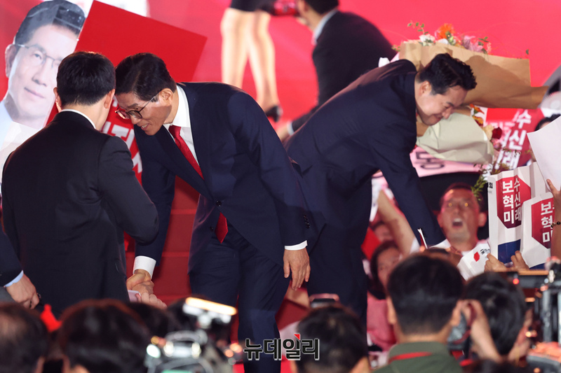 결선에 진출한 김문수, 장동혁 국민의힘 당 대표 후보가 22일 충북 청주시 흥덕구 청주오스코에서 열린 제6차 전당대회에서 당원들과 인사를 나누고 있다. (충북 청주=이종현 기자)