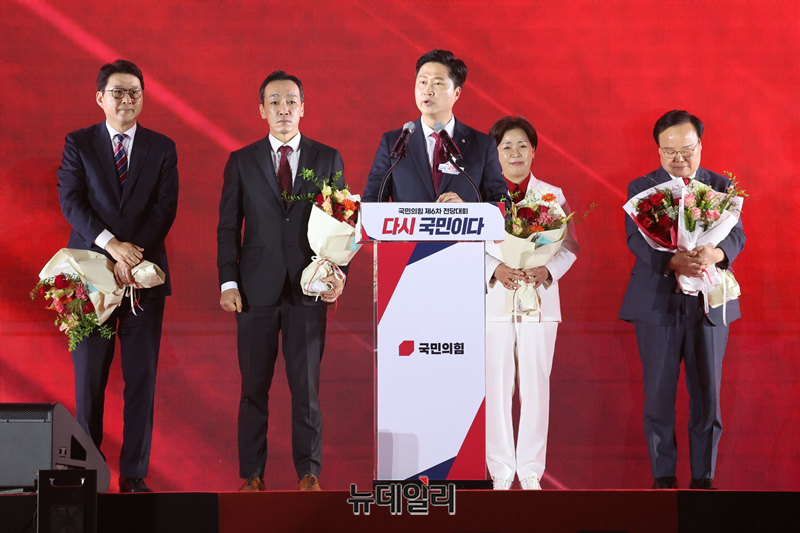 우재준 국민의힘 신임 청년최고위원이 22일 오후 충북 청주 오스코에서 열린 제6차 전당대회에서 수락연설을 하고 있다. (충북 청주=이종현 기자)