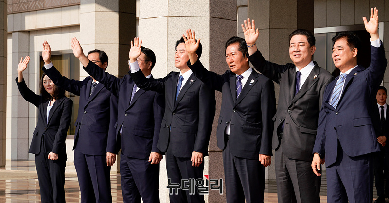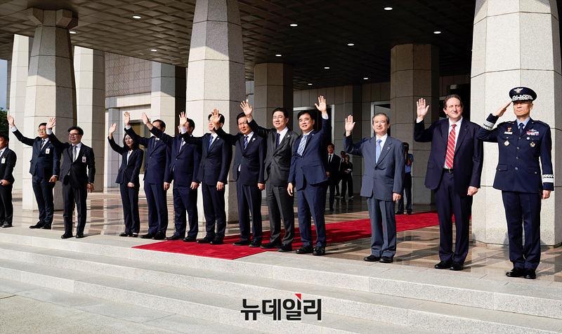 강훈식 비서실장, 정청래 더불어민주당 대표, 김병기 원내대표를 비롯한 참석자들이 23일 오전 경기 성남시 서울공항에서 공군 1호기를 향해 인사하고 있다. (경기 성남=서성진 기자)