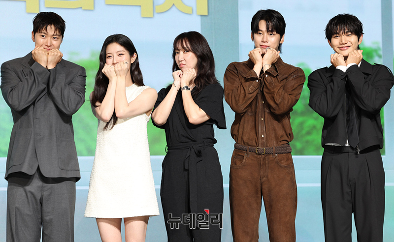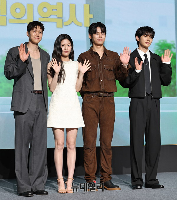 배우 공명(왼쪽부터), 신은수, 차우민, 윤상현이 25일 오전 서울 마포구에서 호텔 나루 서울 엠갤러리에서 열린 넷플릭스 영화 '고백의 역사(각본 감독 남궁선)' 제작보고회에서 포즈를 취하고 있다.'고백의 역사'는 1998년, 열아홉 소녀 박세리가 일생일대의 고백을 앞두고 평생의 콤플렉스인 악성 곱슬머리를 펴기 위한 작전을 계획하던 중 전학생 한윤석과 얽히며 벌어지는 청춘 로맨스다.배우 공명, 신은수, 차우민, 윤상현 등이 출연한다. 29일 공개.
