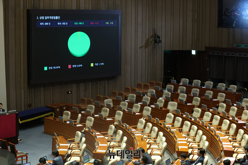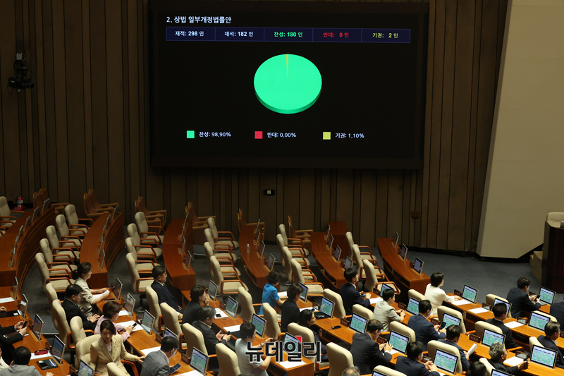 상법 일부개정법률안(2차 상법 개정안)이 25일 오전 국회 본회의에서 더불어민주당 주도로 통과되고 있다.