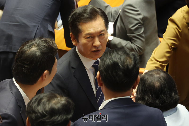 정청래 더불어민주당 대표가 25일 오전 국회 본회의에서 같은 당 의원들과 대화를 나누고 있다.