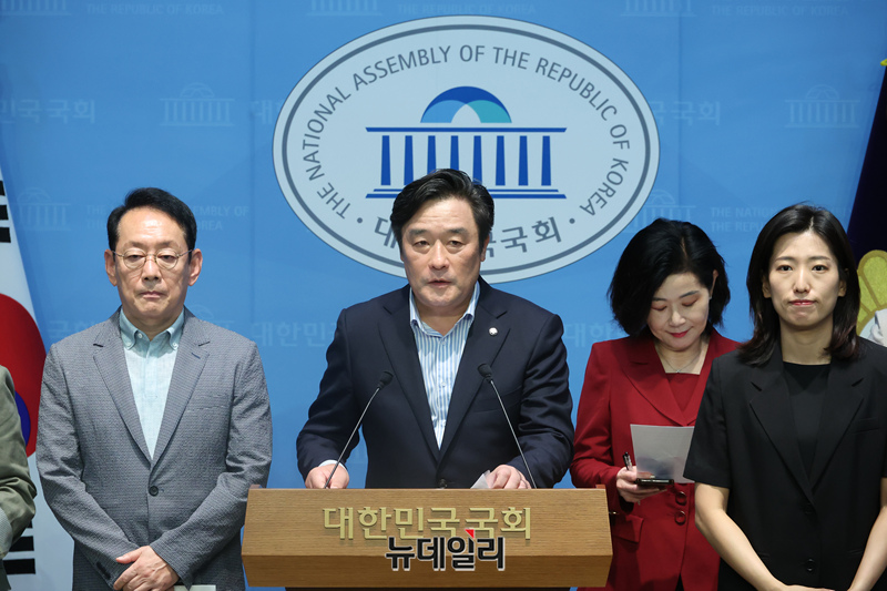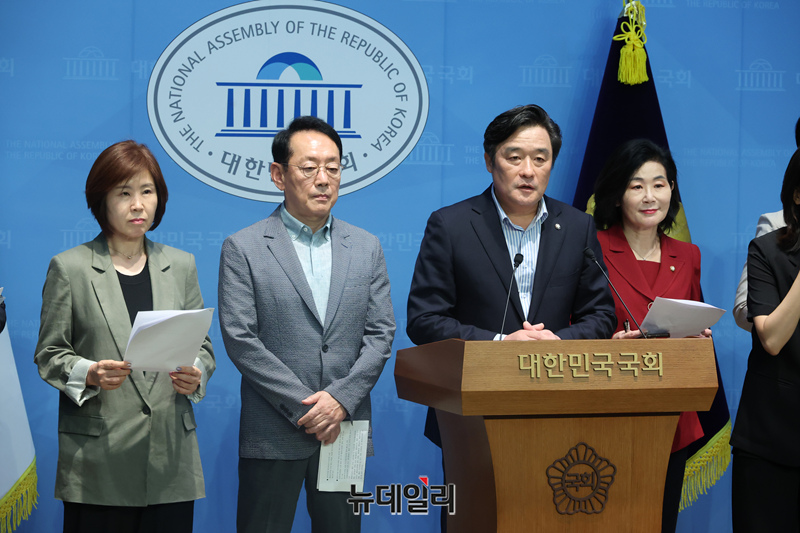 부산지역 국민의힘 의원들(서지영, 박수영, 정동만, 김미애, 김도읍, 곽규택, 김희정, 조승환, 박성훈)이 25일 국회 소통관에서 해양수산부 이전 특별법 관련 해수부 기능 강화와 해양산업 발전을 위한 내용이 담겨야 한다며 기자회견을 하고 있다.