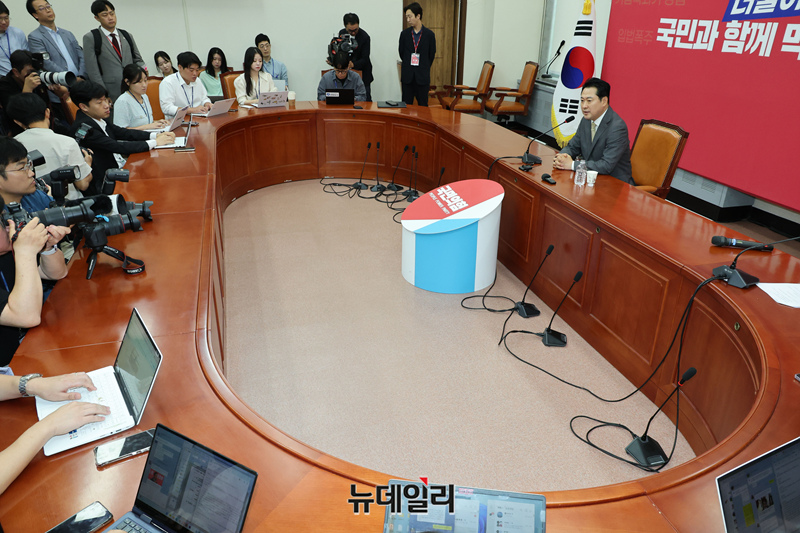 장동혁 국민의힘 신임 대표가 26일 오전 국회에서 기자간담회를 갖고 취재진의 질문에 답변하고 있다.
