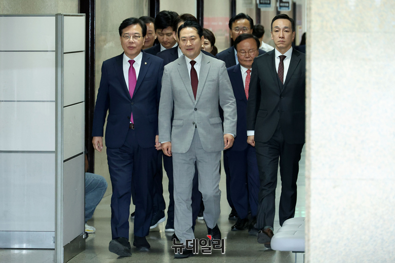 장동혁 국민의힘 대표와 송언석 원내대표 및 최고위원들이 27일 오전 국회에서 열린 최고위원회의에 입장하고 있다.